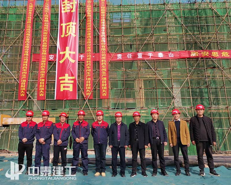 2020年11月16日上午11點18分,初冬的暖陽照耀著豫東大地,隨著鞭炮聲的響起,最后一方混凝土澆筑完成,中泰建工承建的河南項城樂普藥業股份有限公司原料藥車間項目喜封金頂。